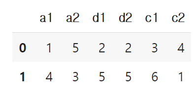 df1과 df2의 열을 교대로 합쳐보자. 열의 순서가 a1-a2-d1-d2-c1-c2가 되면 된다
