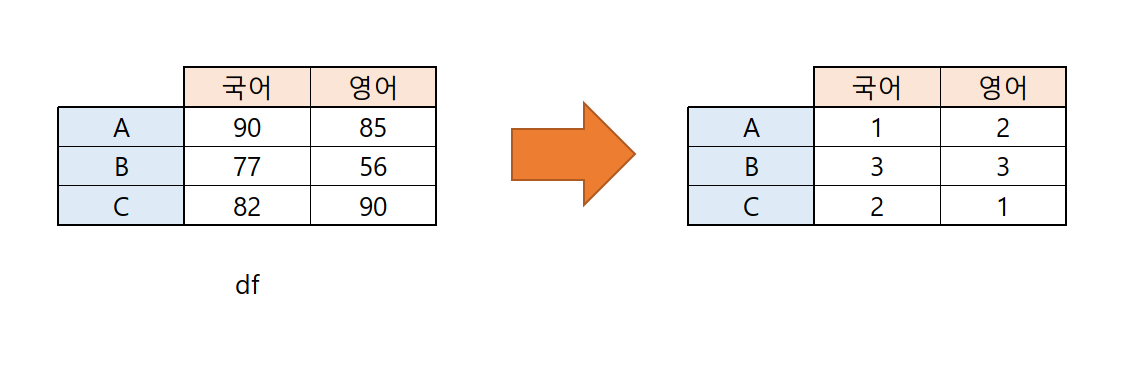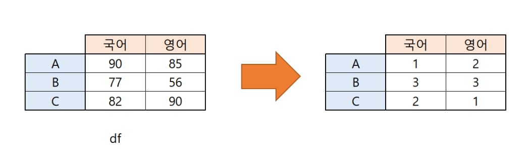 과목별 점수로 이루어진 데이터프레임을 이용해 석차로 이루어진 데이터프레임을 만들어 보자