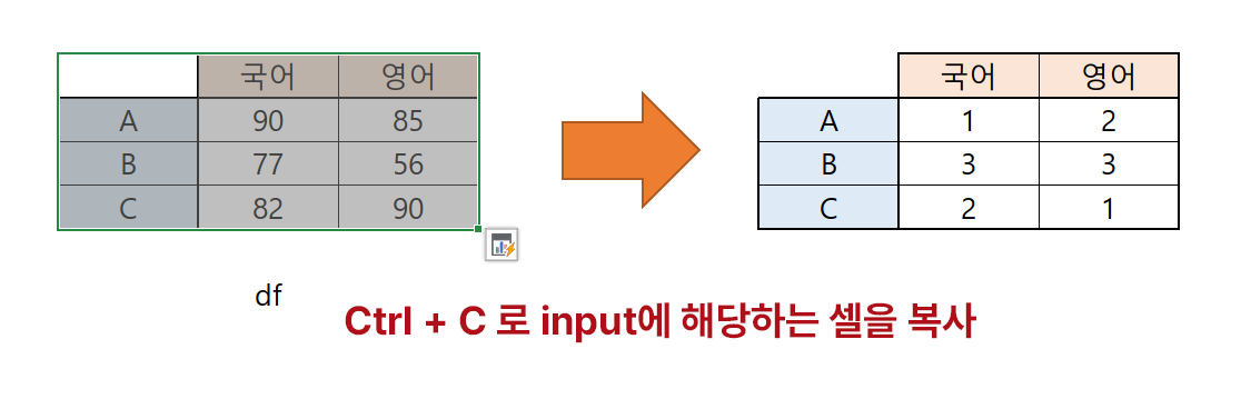 과목별 점수로 이루어진 데이터프레임을 이용해 석차로 이루어진 데이터프레임을 만들고 싶습니다