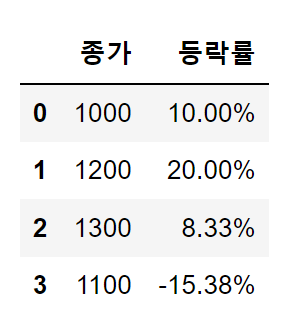 '등락률': {0: 0.1, 1: 0.2, 2: 0.0833, 3: -0.1538}}