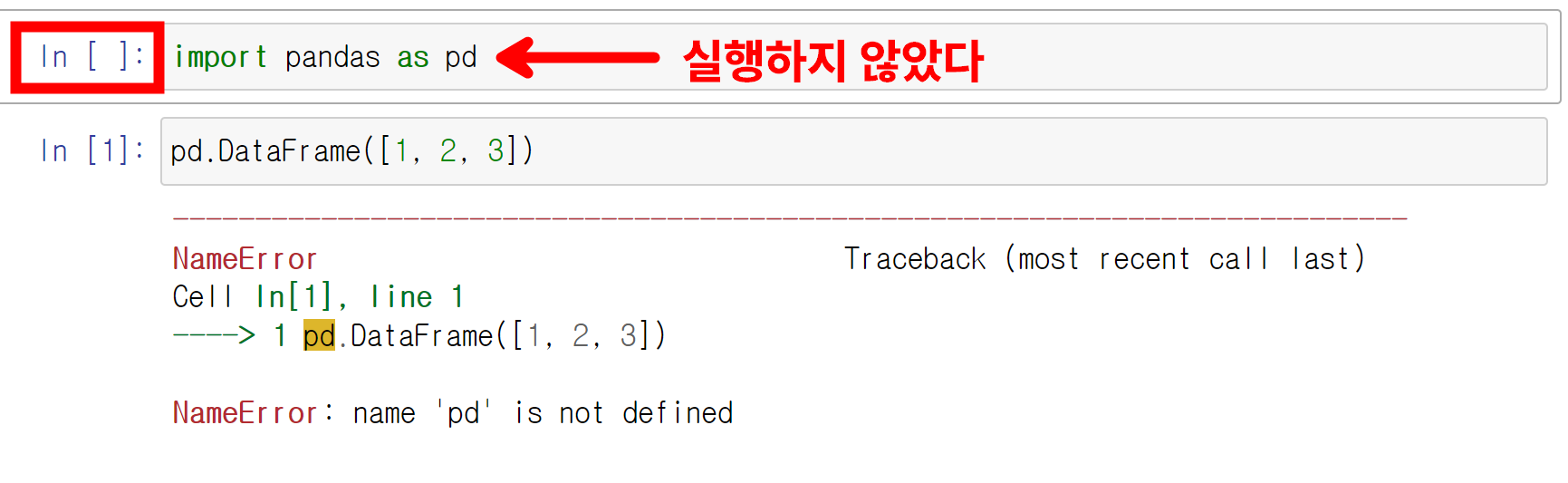 그 외에도 오타가 있거나, 판다스 라이브러리가 제대로 설치되지 않았거나, as pd와 같은 별칭을 생략했을 때도 NameError가 발생할 수 있으니 참고하시기를 바랍니다.