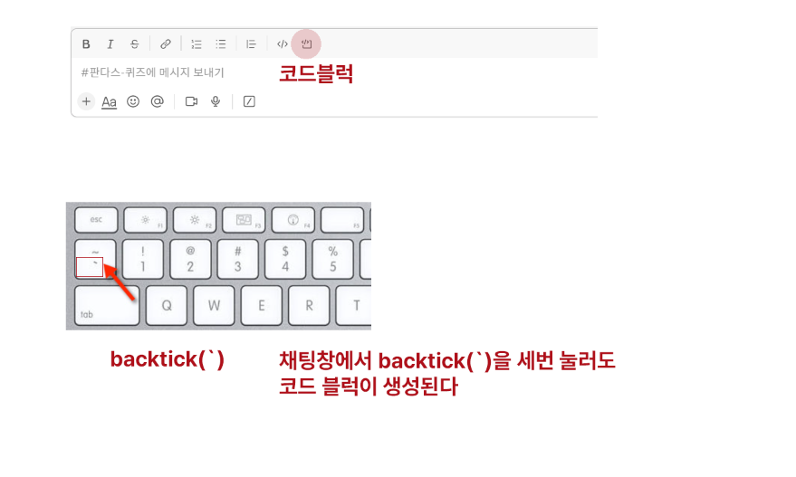 창에서 backtick을 세번 눌러도 코드블럭이 생성된다