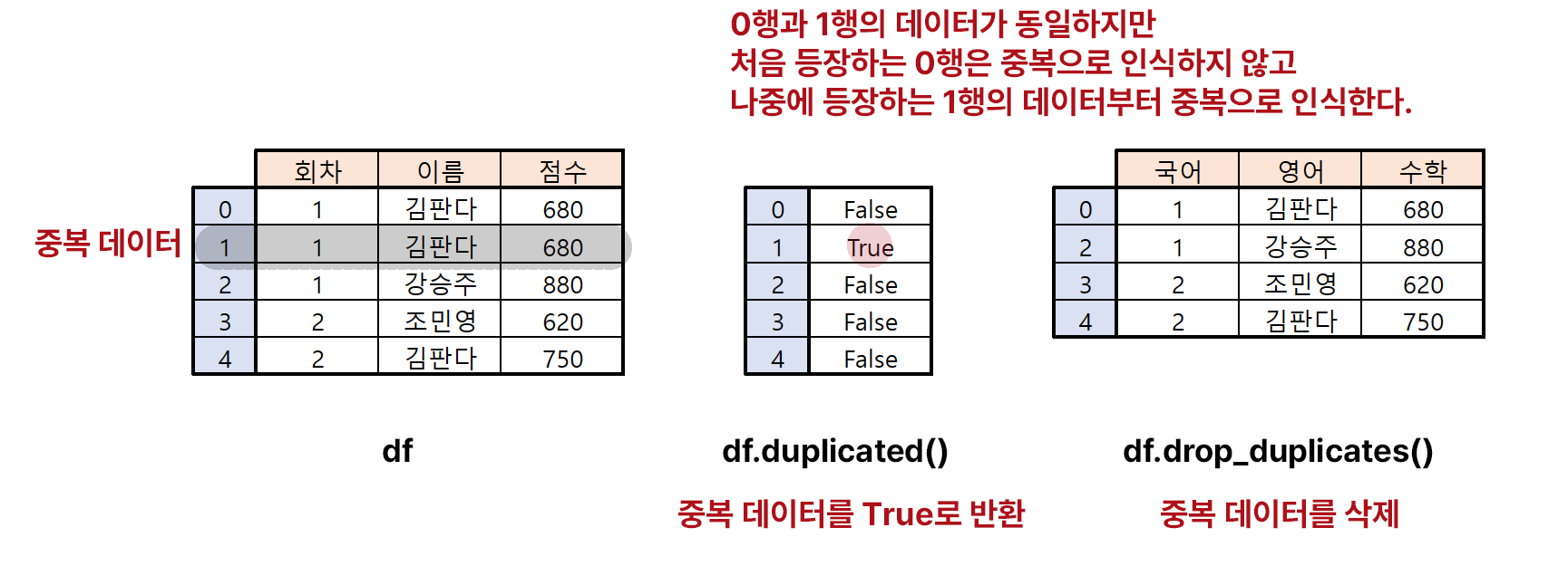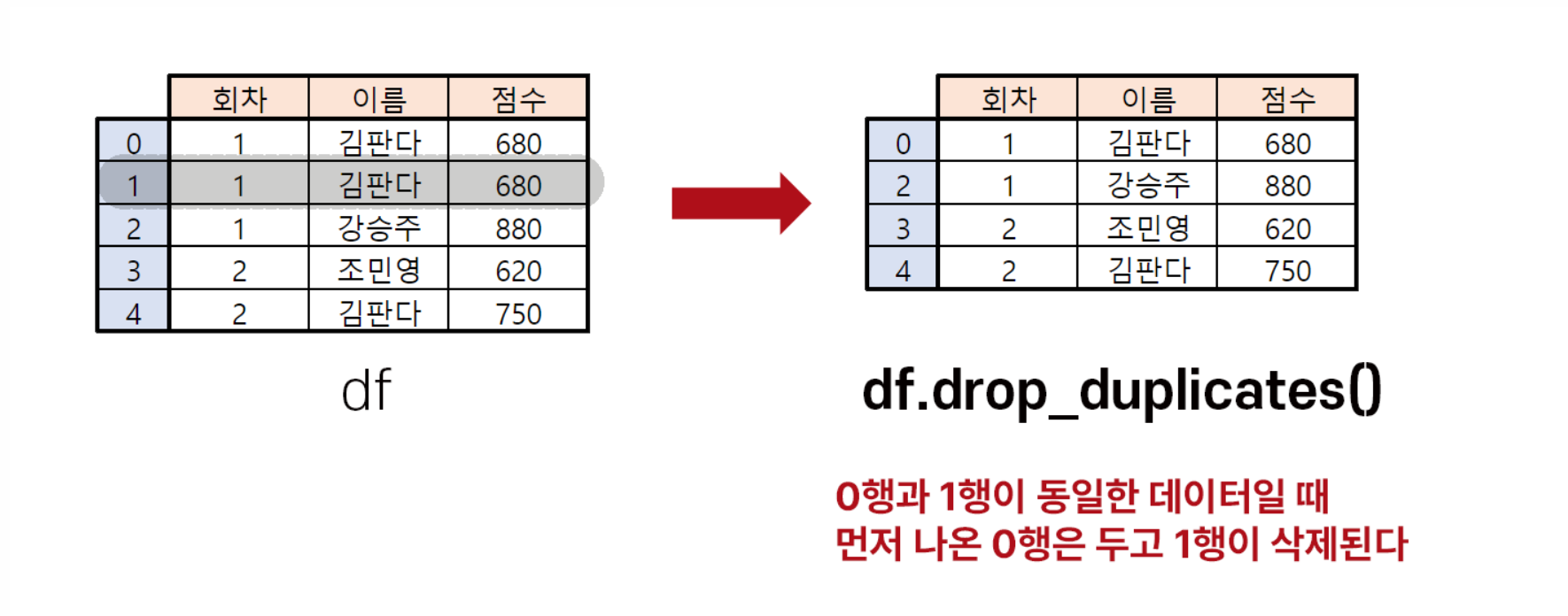 - 'first' : 처음 나온 값을 남기고 나머지를 삭제한다. 위의 예에서 0행이 남고 1행이 삭제되었다.