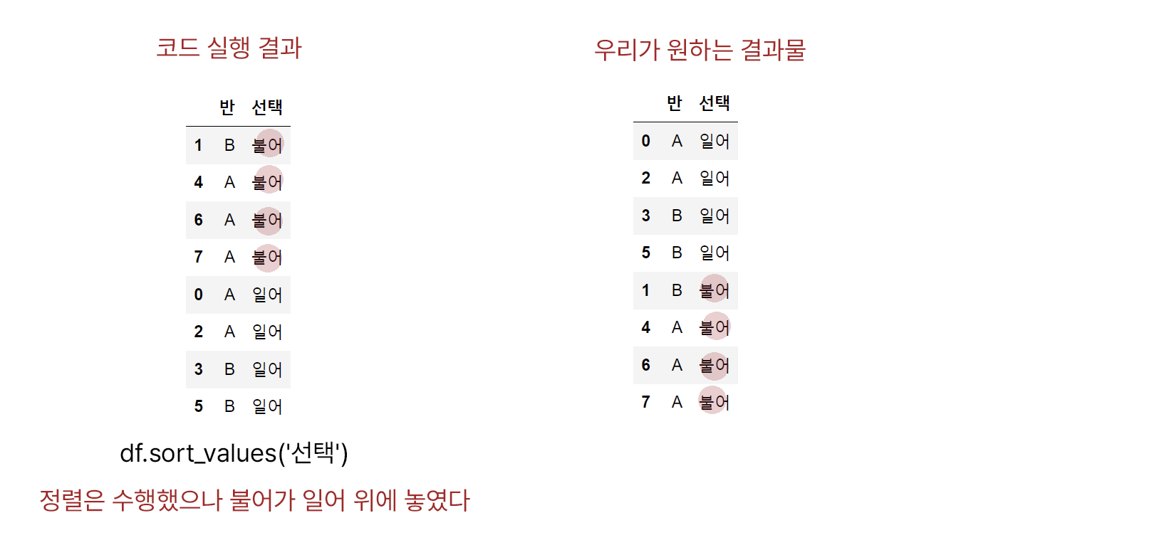 위 데이터 프레임을 선택으로 정렬하기 위해 다음과 같은 코드를 썼어