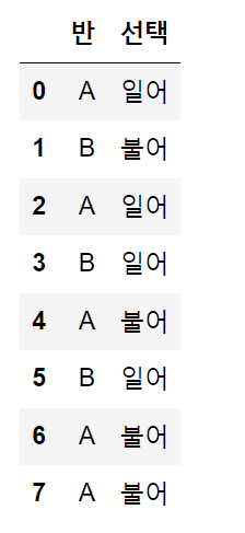 data1 = {'반': ['A', 'B', 'A', 'B', 'A', 'B', 'A', 'A'],