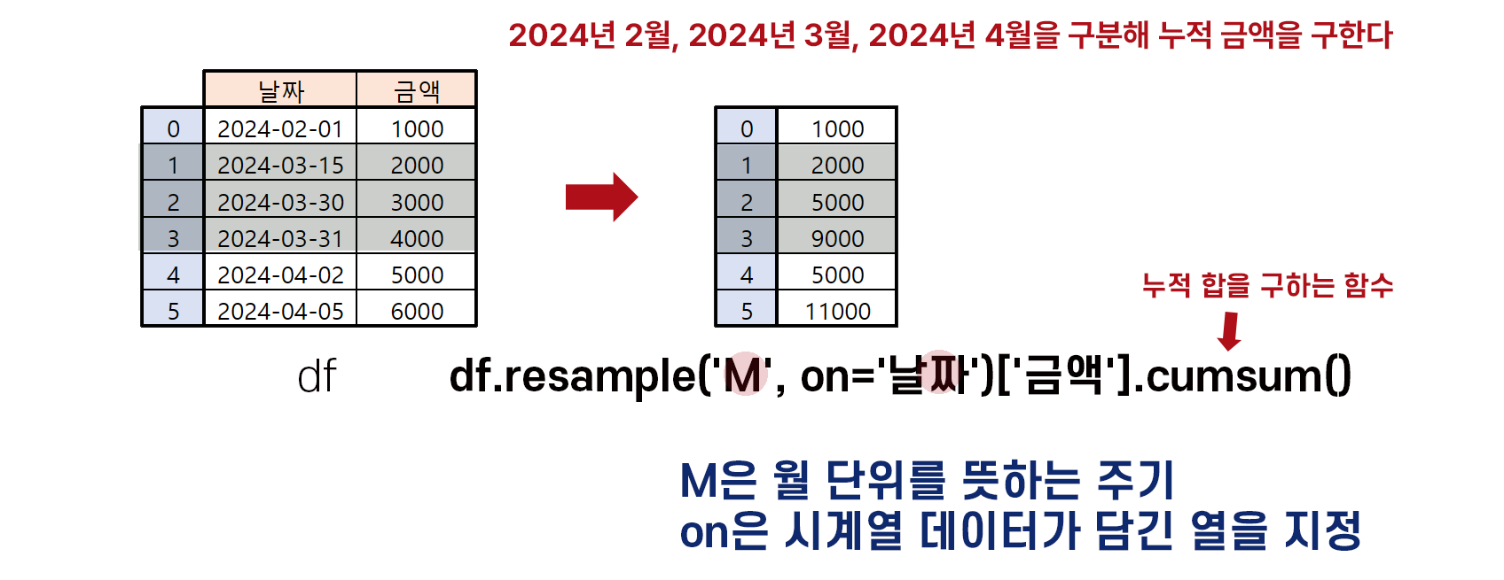 df.resample('M', on='날짜')['금액'].cumsum()