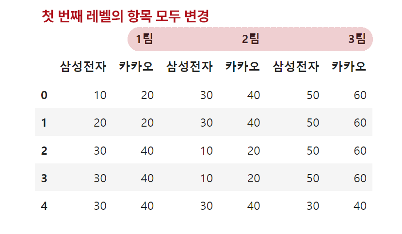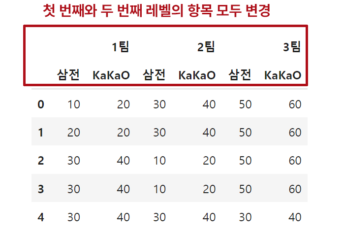 또한 set_levels 함수를 사용하면 여러 레벨의 항목을 동시에 수정할 수 있습니다. 이번에는 첫 번째 레벨과 두 번째 레벨의 항목을 모두 수정해 보겠습니다. (위 결과에 추가로 삼성전자 → 삼전, 카카오 → KaKaO)