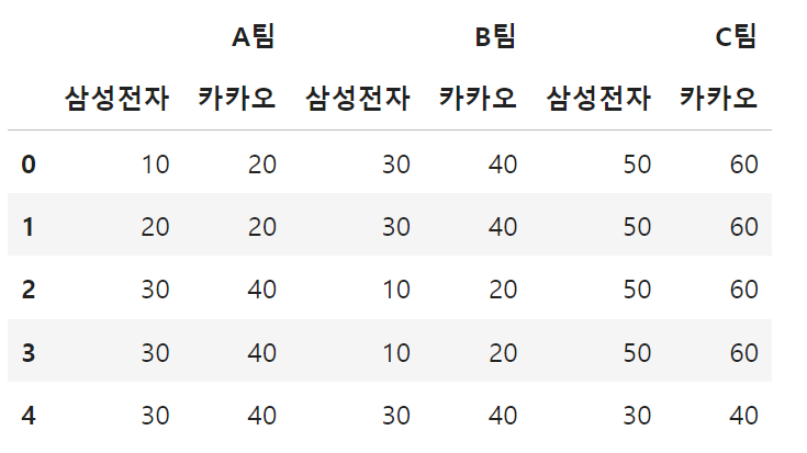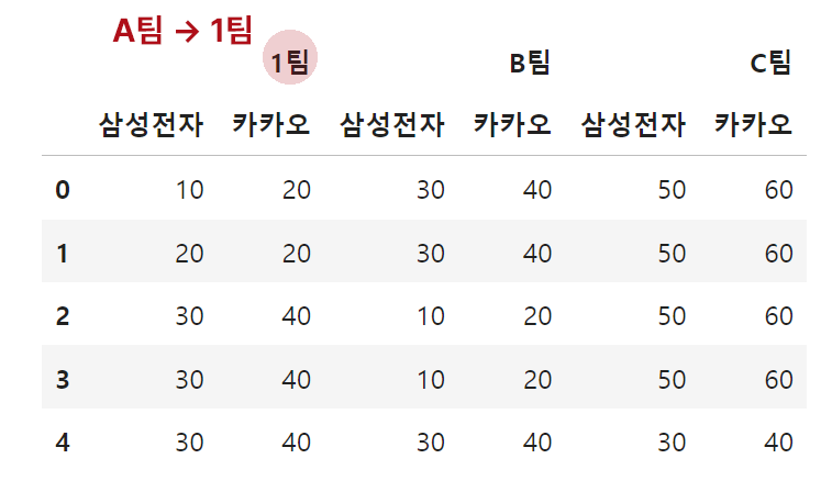 MultiIndex([('A팀', '삼성전자'),
