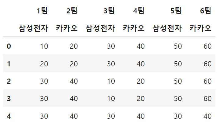 data1 = {('A팀', '삼성전자'): [10, 20, 30, 30, 30],