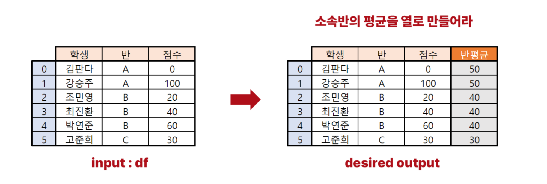 이 df를 활용해 그림처럼 소속반의 평균이 담긴 열을 만들어보자