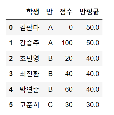 예를 들어 A반의 학생은 첫번째 행의 김판다와 두번째 행의 강승주이다. 둘의 점수가 0점과 100점이니 A반의 평균은 50이 되고 A반 소속인 김판다와 강승주의 데이터는 반평균열에서 둘다 50이 된다