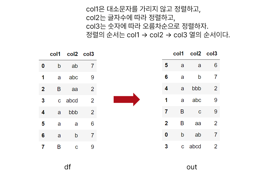 보다 세련된 방법은 sort_values 함수에 매개변수 key로 정렬용 함수를 전달하는 것인데, 결국 sort_values의 key에 열마다 다른 함수를 적용해야 합니다.