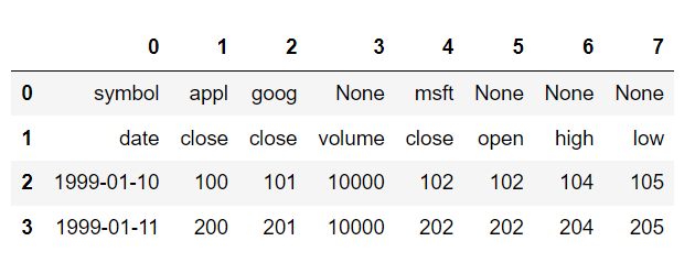 data1 = [['symbol', 'appl', 'goog', 'None', 'msft', 'None', 'None', 'None', 'None'],