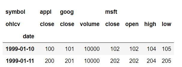df.ffill(axis=1).iloc[:2, 1:].T, names=['symbol', 'ohlcv'])
