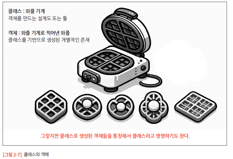 클래스는 객체를 생성하는 틀로 실제로 클래스라는 틀을 통해 생성된 개별적인 존재를 객체라고 한다. 예를 들어 와플 기계가 클래스라면 그 기계로 만들어진 와플은 객체이다. 그러나 클래스로 생성된 객체들 역시 단순히 클래스라고 흔히 불러 이는 입문자들을 혼란스럽게 한다.
