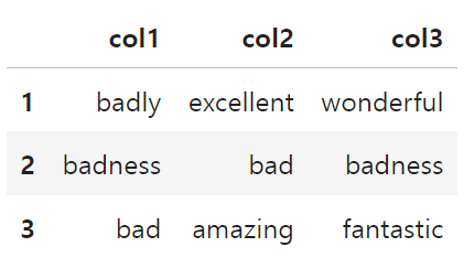 'col3': ['awesome', 'wonderful', 'badness', 'fantastic']
