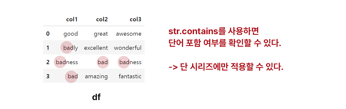 이 코드는 데이터 프레임의 col1 열에 대해 str.contains를 적용하여, col1 열에서 'bad'라는 문자열이 셀에 포함된 행을 찾아낼 수 있습니다.