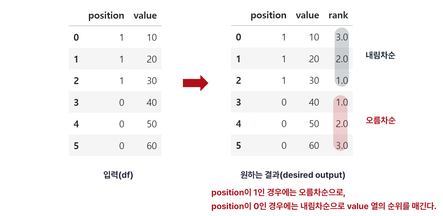 df에서 우리는 position 열을 기준으로 각 그룹의 순위를 서로 다른 방향으로 적용하고자 합니다. 구체적으로 position이 1인 경우에는 오름차순으로, position이 0인 경우에는 내림차순으로 value 열의 순위를 매기고자 합니다.