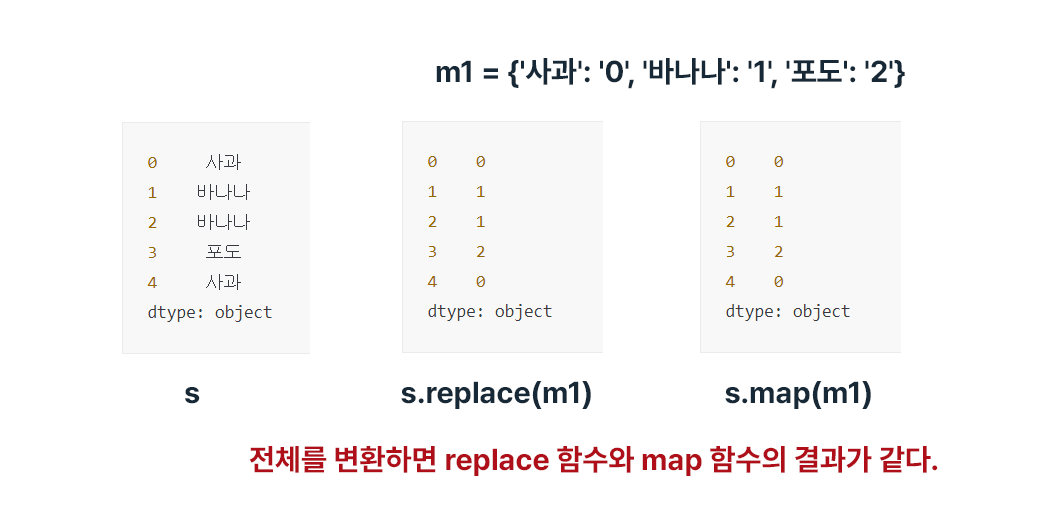 위의 시리즈 s에서 사과, 바나나, 포도의 값을 각각 '0', '1', '2'로 변환해 보겠습니다. 이 경우 replace와 map을 사용했을 때 모두 동일한 결과가 도출됩니다.