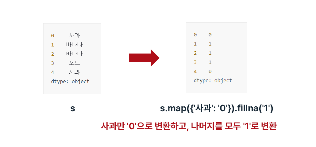 map 함수가 매핑되지 않은 값을 NaN으로 반환하기 때문에, 변환하지 않는 값을 일괄적으로 처리할 때 유용합니다. 예를 들어 사과만 0으로 매핑한 뒤 나머지 모든 값을 fillna 함수를 사용해 1로 대체할 수 있습니다.