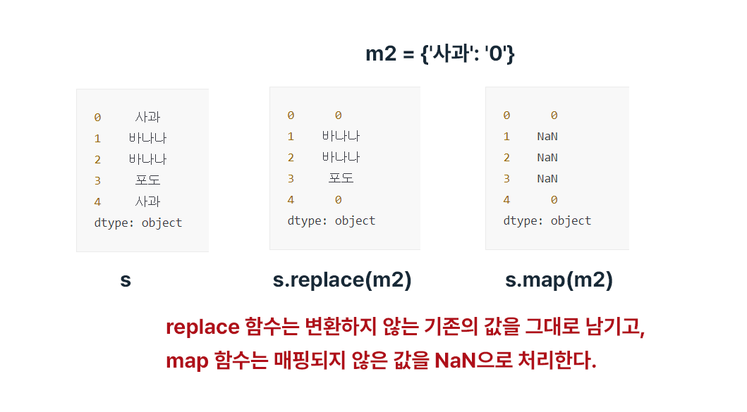 replace 함수는 사과만 '0'으로 변환하고 나머지 바나나와 포도를 그대로 유지합니다. 반면 map 함수는 사과를 제외한 나머지 값들을 NaN으로 처리합니다.