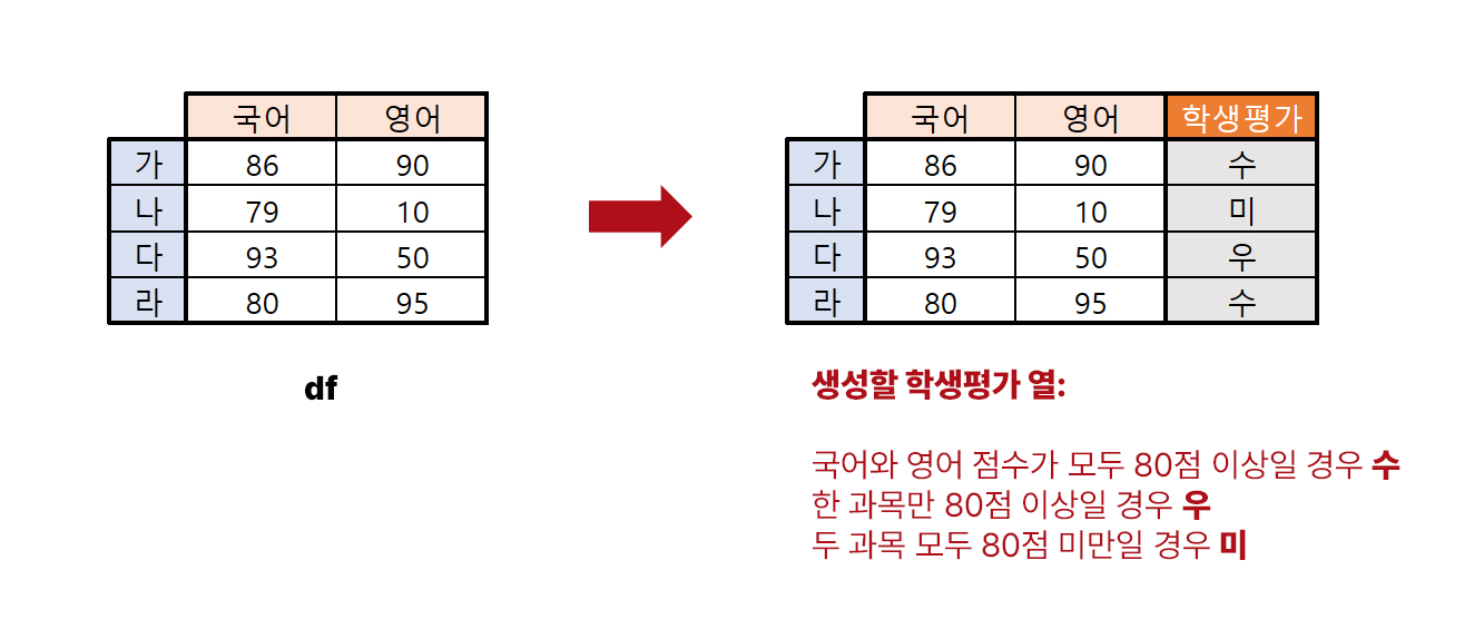 df에서 국어와 영어 점수를 기준으로 평가를 부여하는 작업을 진행해 보겠습니다. 국어와 영어 점수가 모두 80점 이상일 경우 수, 한 과목만 80점 이상일 경우 우, 두 과목 모두 80점 미만일 경우 미를 부여할 것입니다.