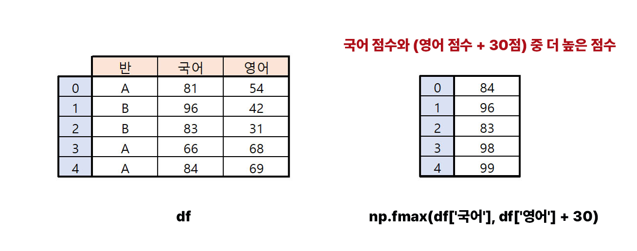 위 코드는 간편하게 국어 점수와 영어 점수에 30점을 더한 값 중 큰 값을 반환합니다. 데이터 프레임 내에서 열 간의 비교를 수행할 때는 집계 함수를 사용할 수도 있지만, 하나의 데이터 프레임에 속하지 않는 배열 간의 비교가 필요한 경우 np.fmax를 사용하는 것이 더욱 간편합니다.