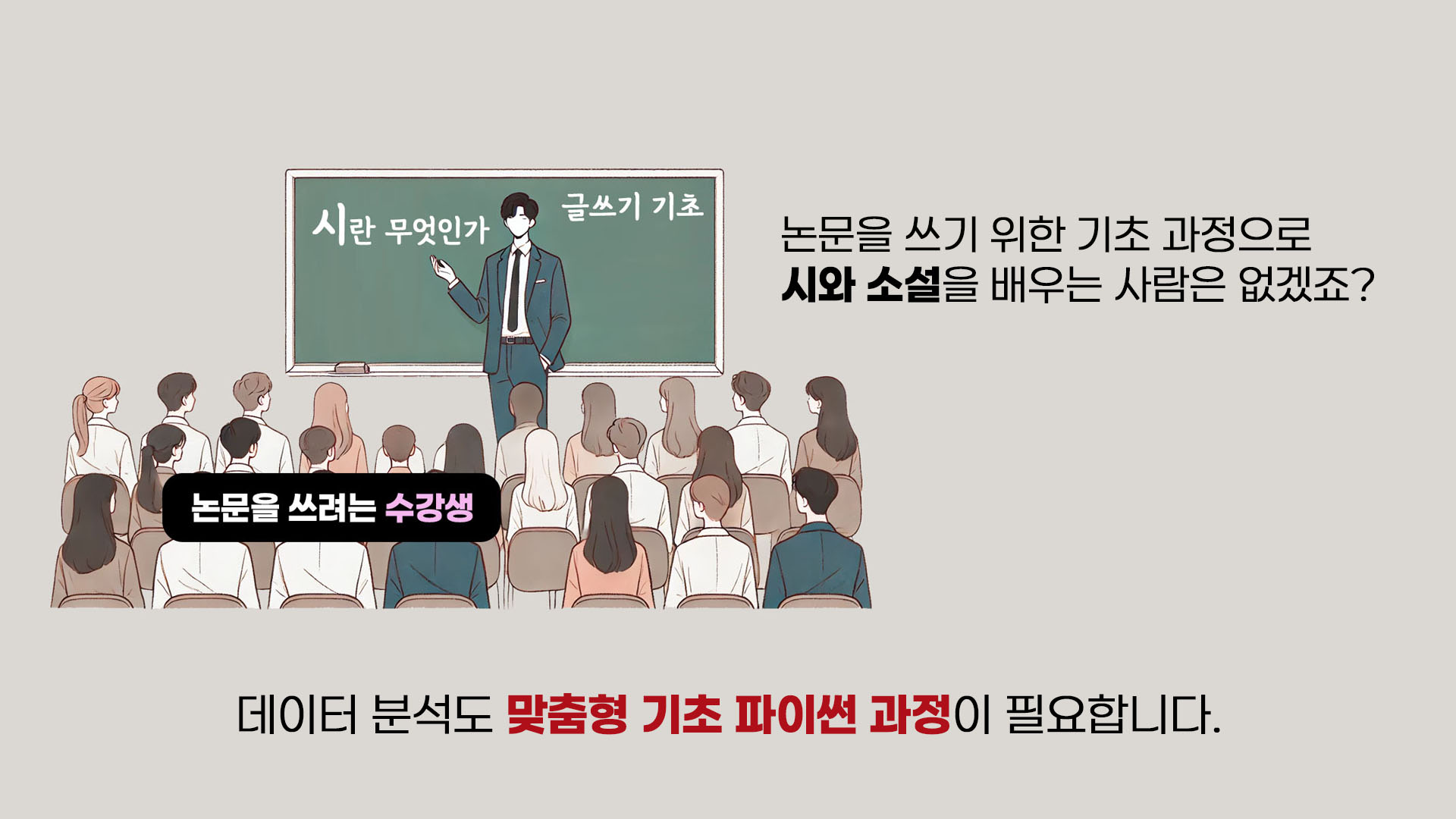 만약 여러분이 영어로 논문을 작성해야 하는데 영어로 글을 써본 경험조차 전무하다면, 영어 논문 작성을 학습하기에 앞서 기초적인 영어 글쓰기를 학습하는 선수 과정이 필요하겠죠? 마찬가지로, 코딩 경험이 없거나 이제까지 코딩에서 큰 성과를 내지 못한 분들이 데이터 분석에 입문하려면 기초적인 파이썬 학습 과정이 필수입니다.