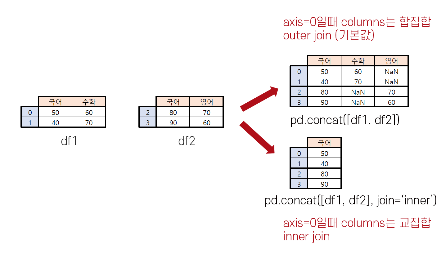 연결할 축 방향을 지정하는 인자. axis=0일때는 각 열이 연결되는 방향(세로)으로 연결하고, axis=1일때는 각 행이 연결되는 방향(가로)으로 연결한다. 그림의 예시는 세로 방향으로 연결되었다.