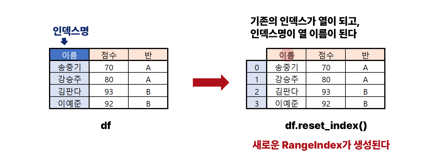 인덱스에서만 제거해 데이터 프레임의 열로 생성할 수도 있고, 데이터를 완전히 삭제할 수도 있다. 인덱스가 제거되면 새로운 RangeIndex가 생성된다.